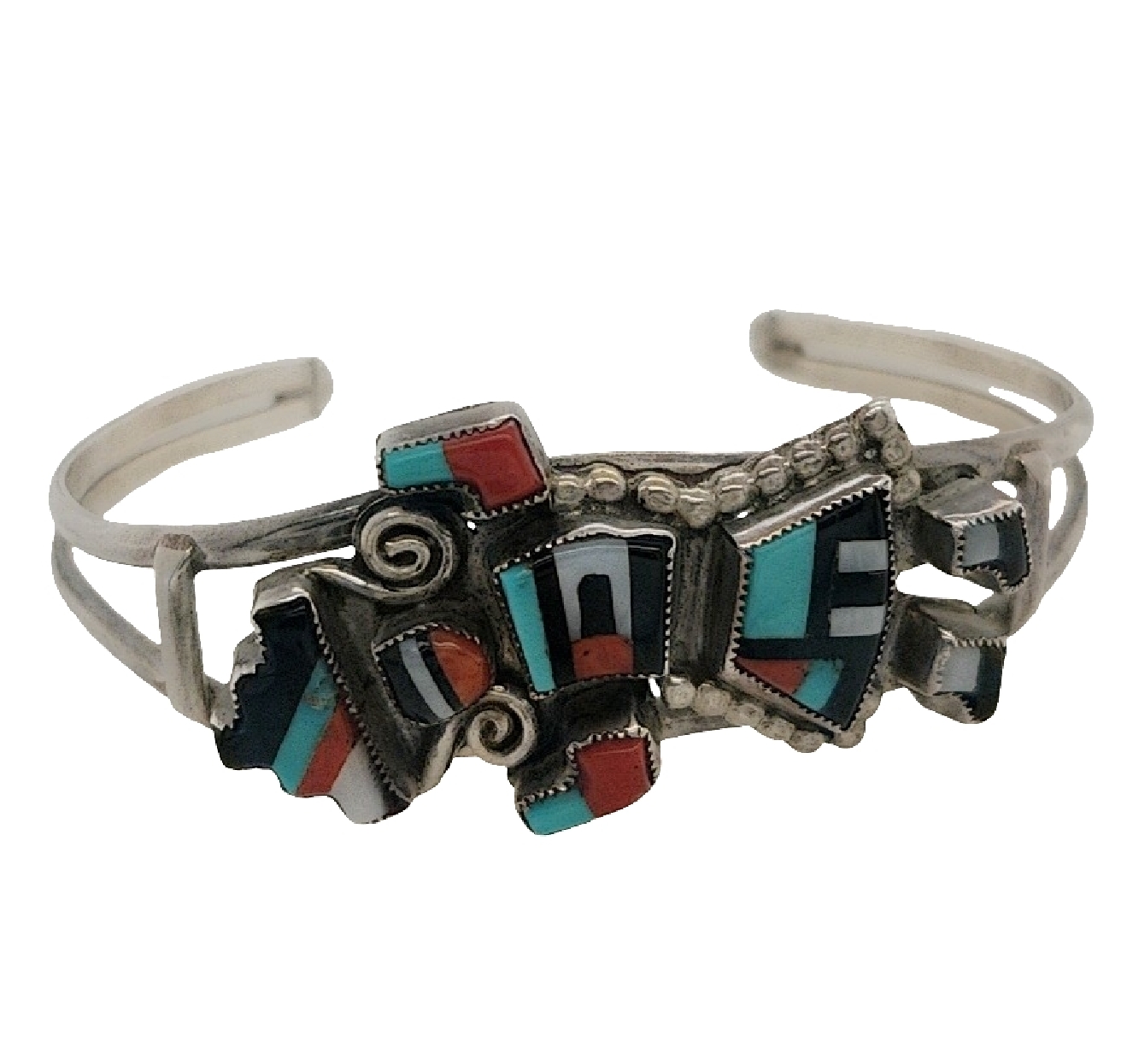 Vintage Sterling Silver Zuni Kachina Doll Cuff Barcelet with Coral; Mother of Pearl; Onyx; and Turquoise Signed by GB Natachu