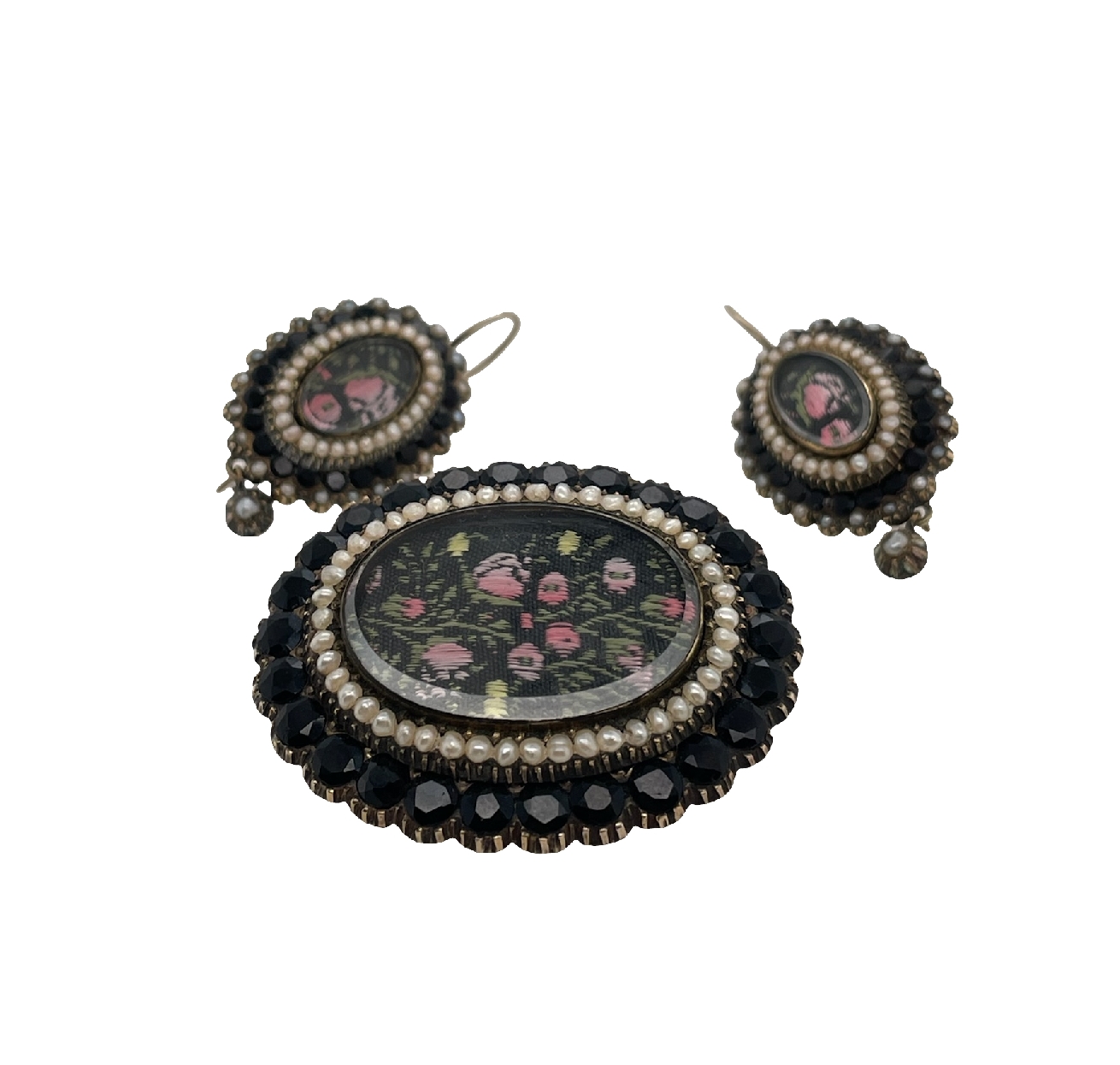 10K yellow gold earring and brooch mourning set with embroidery portrait and onyx and seed pearl halo