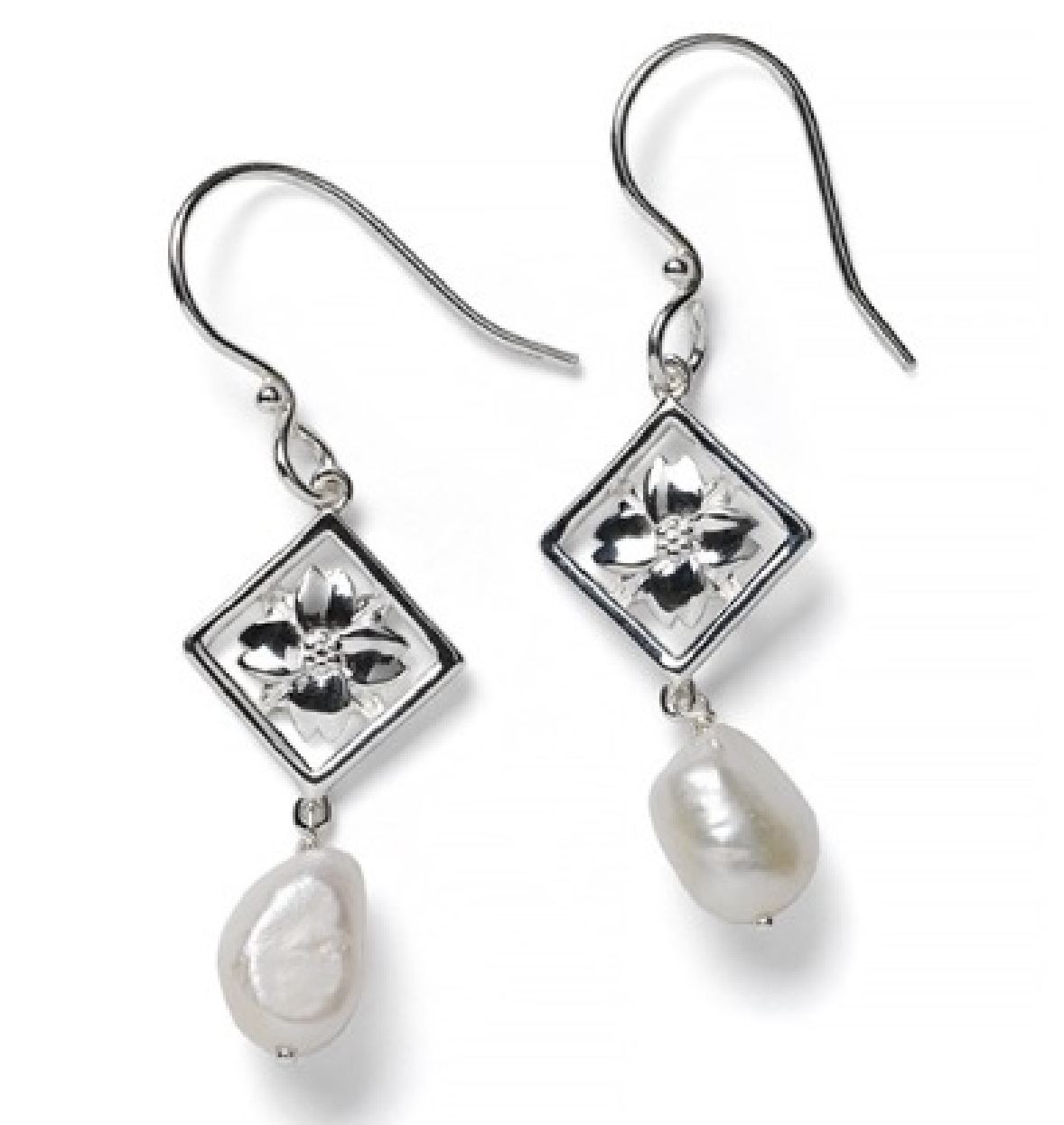 Southern Gates Sterling Silver Courtyard Series Dogwood Dangle Earrings with Baroque Pearl Drops E746
