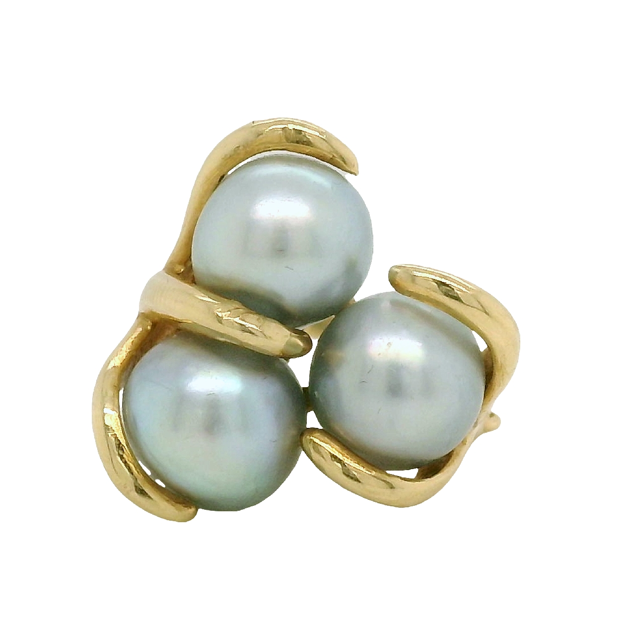 14K Yellow Gold Arthritic Shank Ring with 3 Blueish Grey Pearls in a Clutch Setting Size 7-4