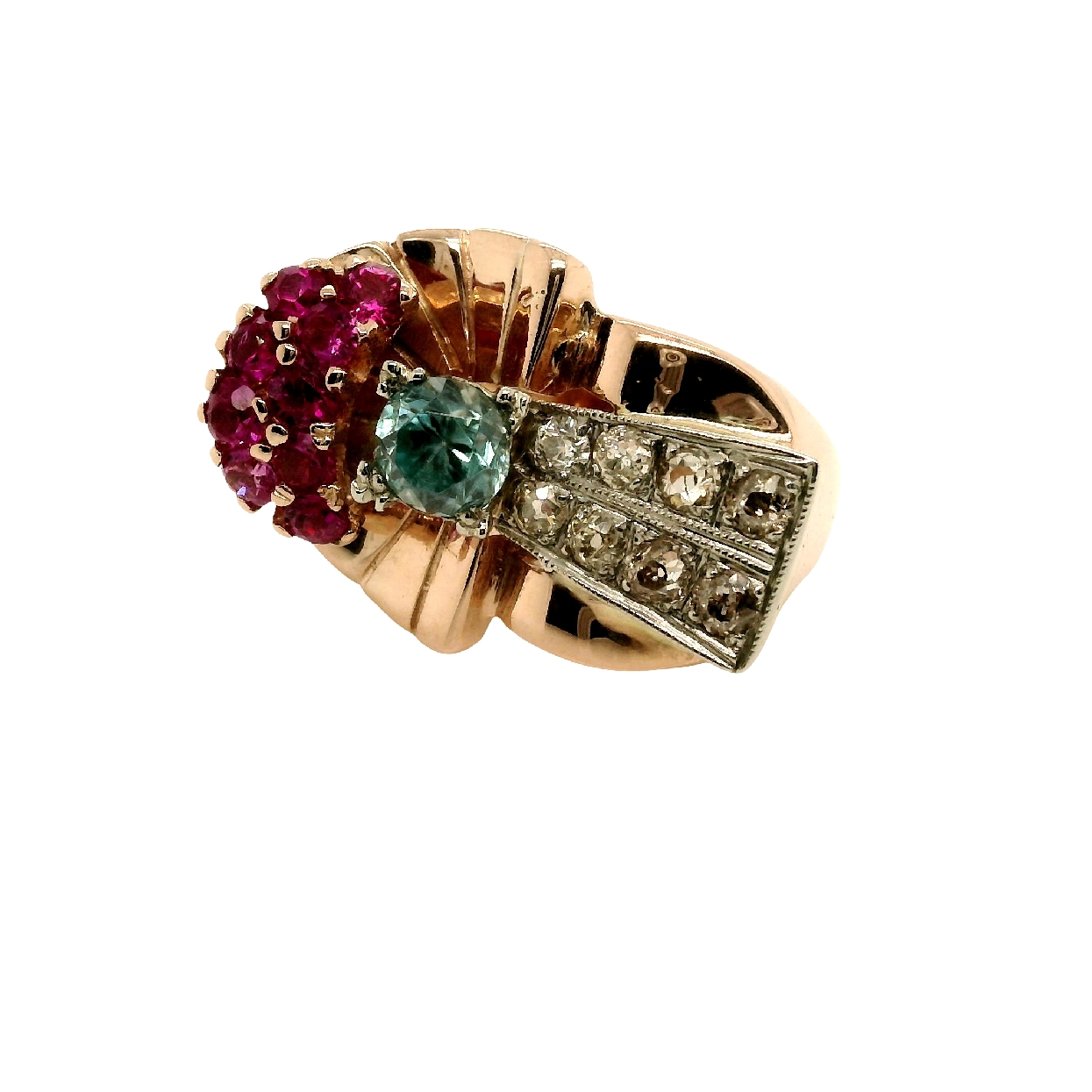 c. 1940 14K Rose Gold Retro Synthetic Rubies and Aquamarine; Old Mine Cut Diamonds Size 6