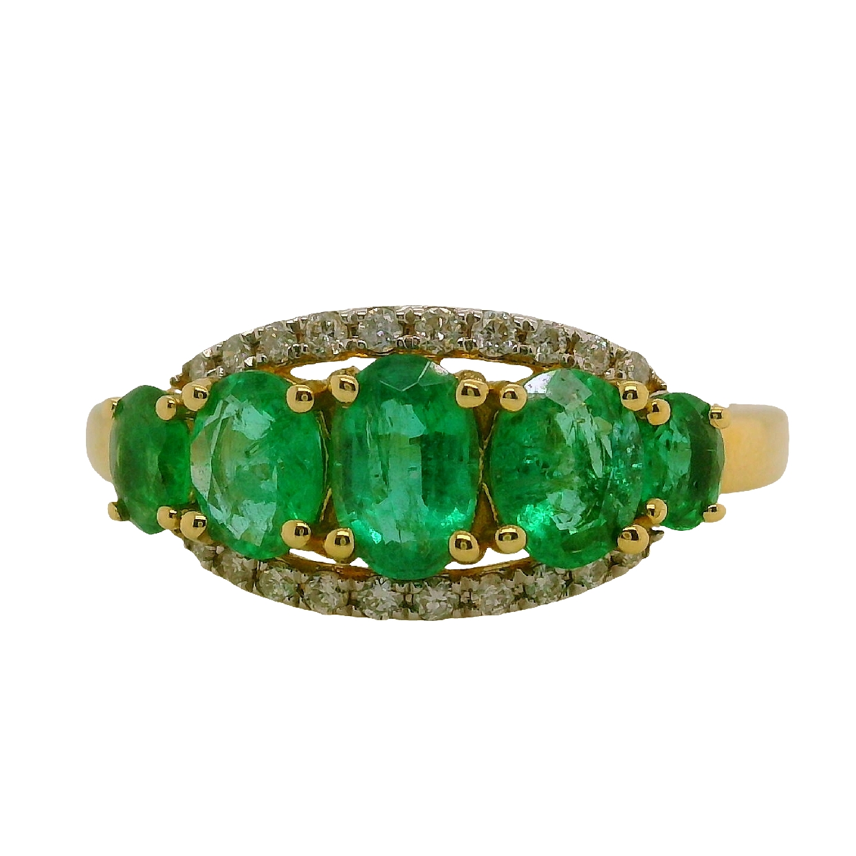 14K Yellow Gold Ring with Five Oval Cut Emeralds and Diamond Surround Detail 1.39 CTTW Emeralds Size 7