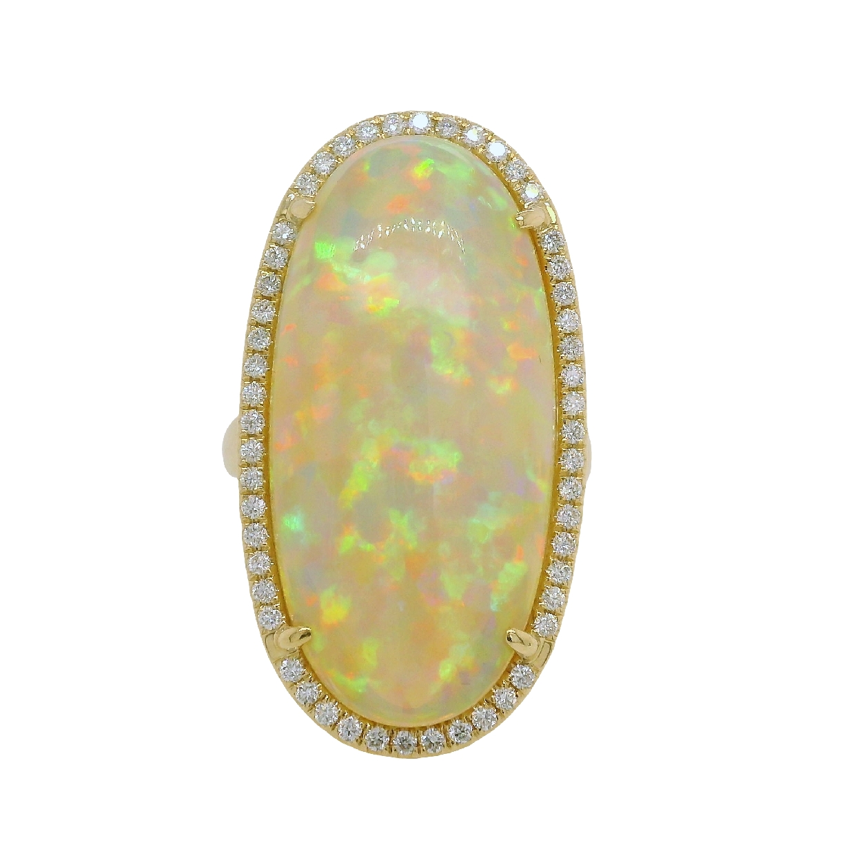 14K Yellow Gold Elongated Oval Cut Opal with Diamond Halo Size 8 0.5CTTW Diamonds